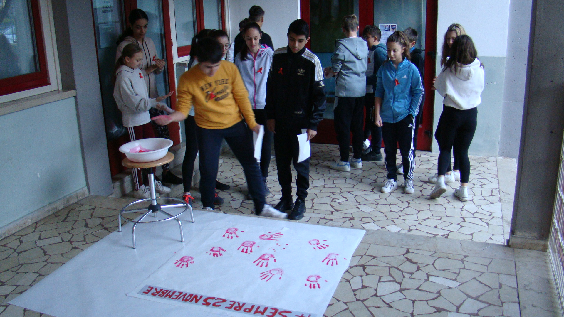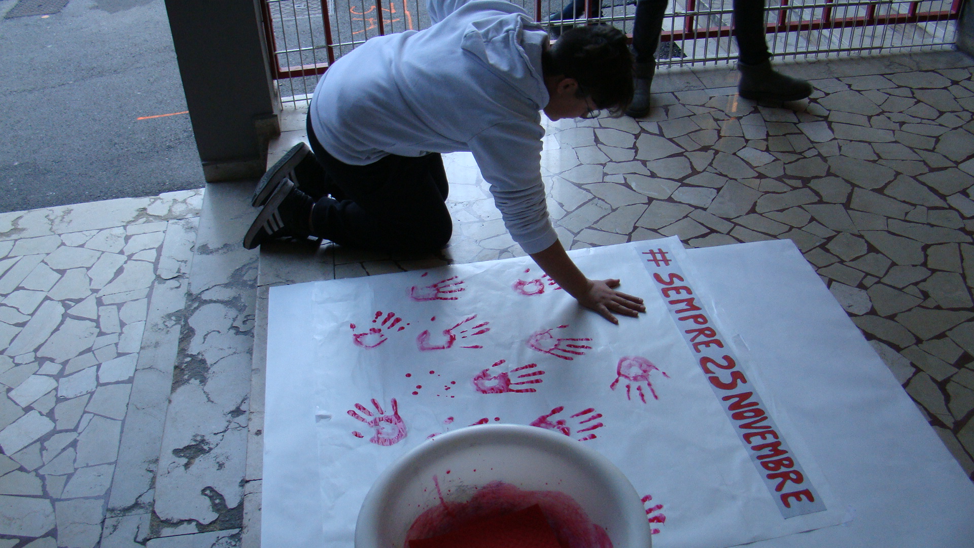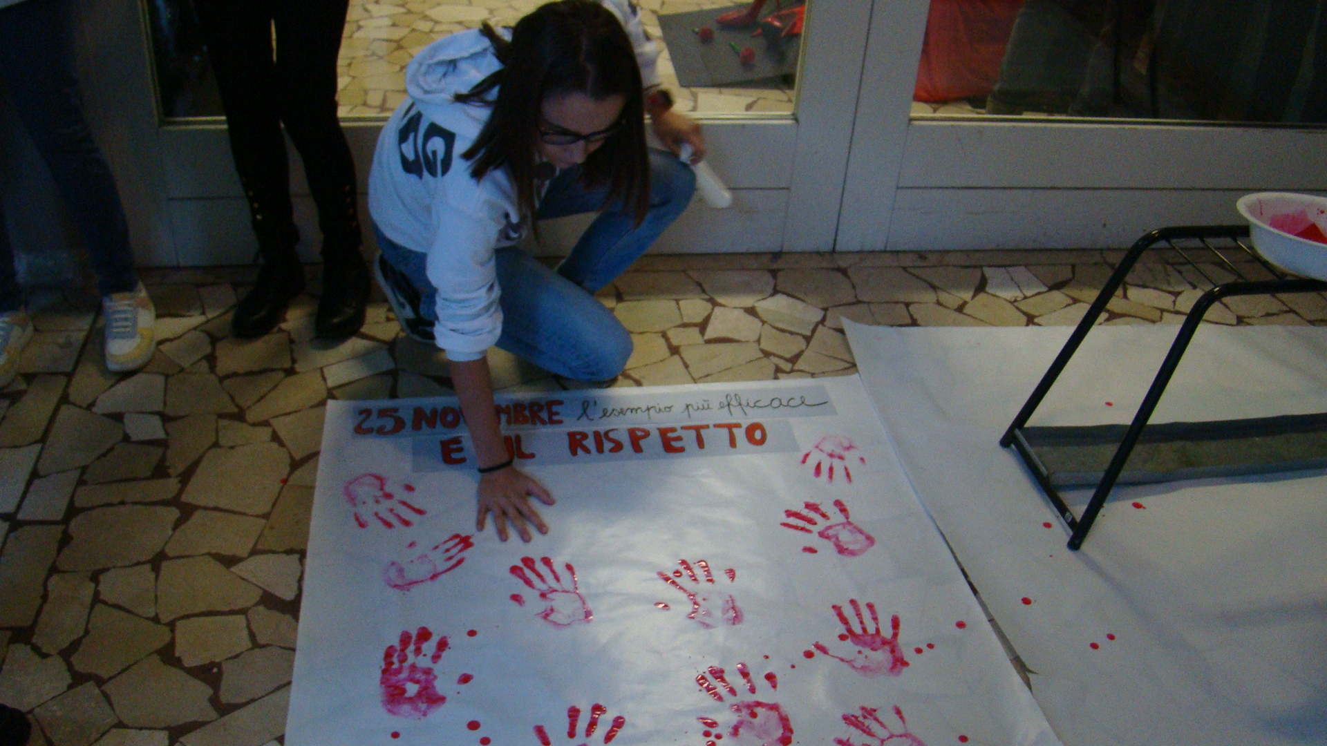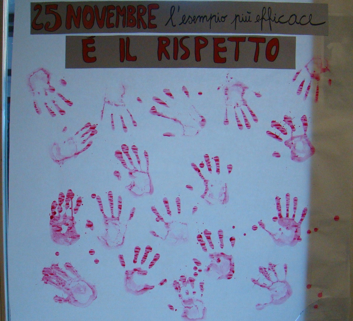 noi di classe  terza abbiamo realizzato un cartellone sul quale, con la tempera rossa, abbiamo lasciato le impronte delle nostre mani, che simboleggiano lo STOP alla violenza sulle donne.