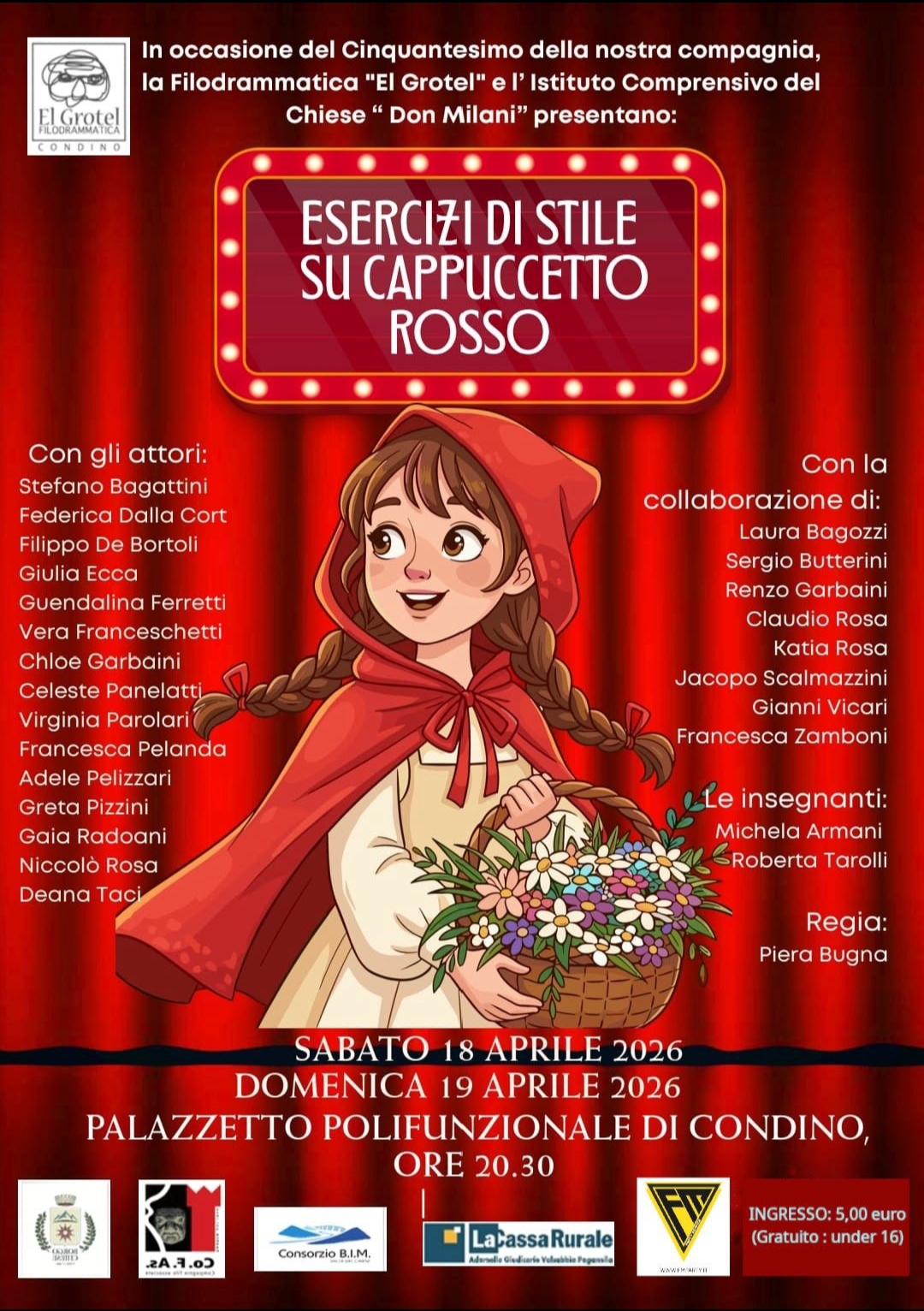 Grande successo per lo spettacolo teatrale “Esercizi di stile su Cappuccetto Rosso”, andato in scena sabato 18 e domenica 19 aprile presso il palazzetto polifunzionale, in occasione del cinquantesimo anniversario della Filodrammatica “El Grotel”.